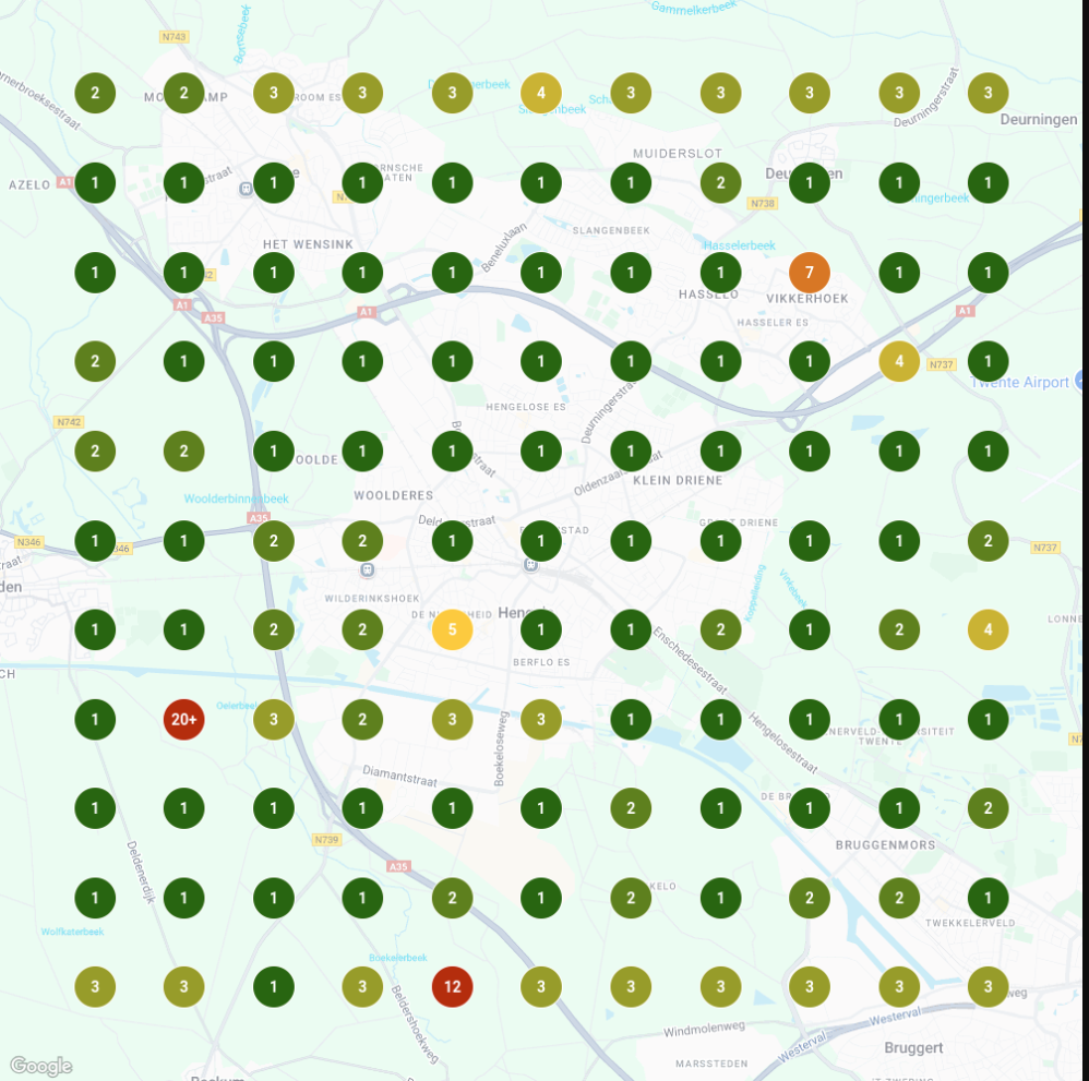Google business profielen worden voor een behoorlijk deel vertoond op basis van de exacte plek waar de zoekopdracht plaatsvind. Wij meten daarom door de hele stad van de locatie op welke plek precies er gerankt wordt.